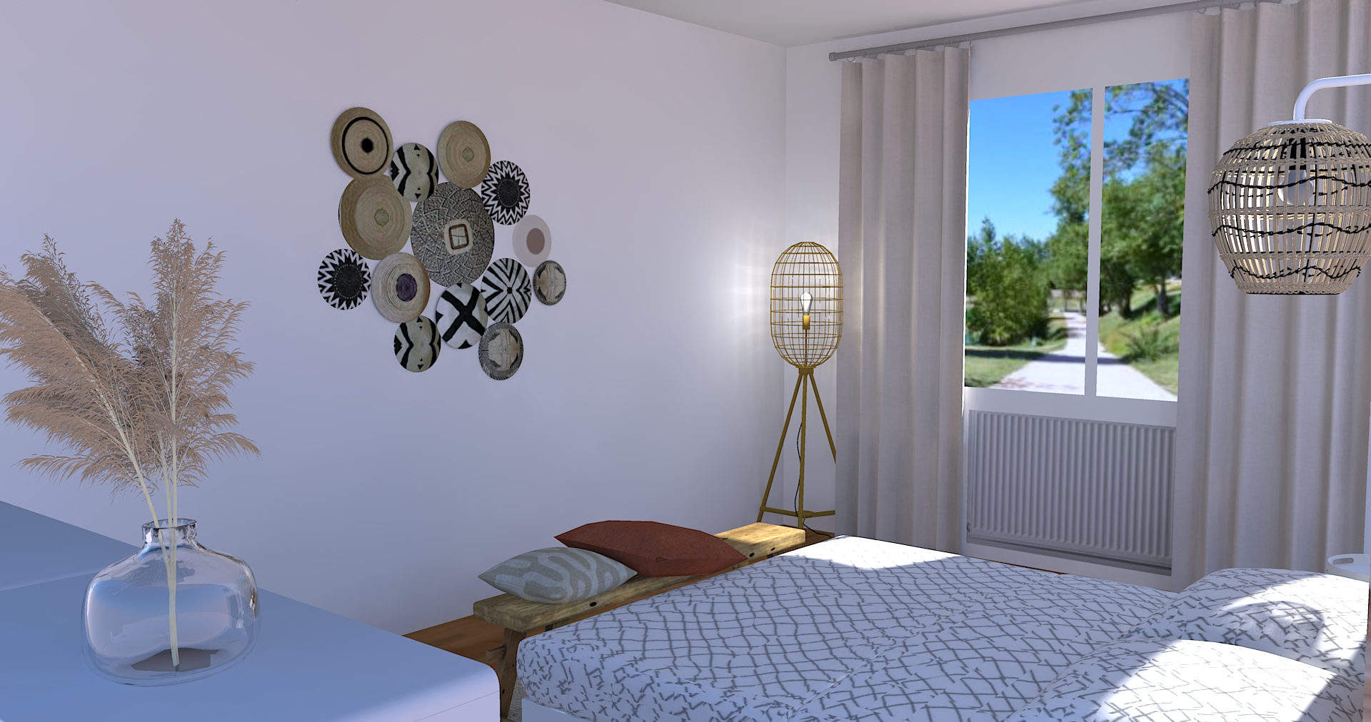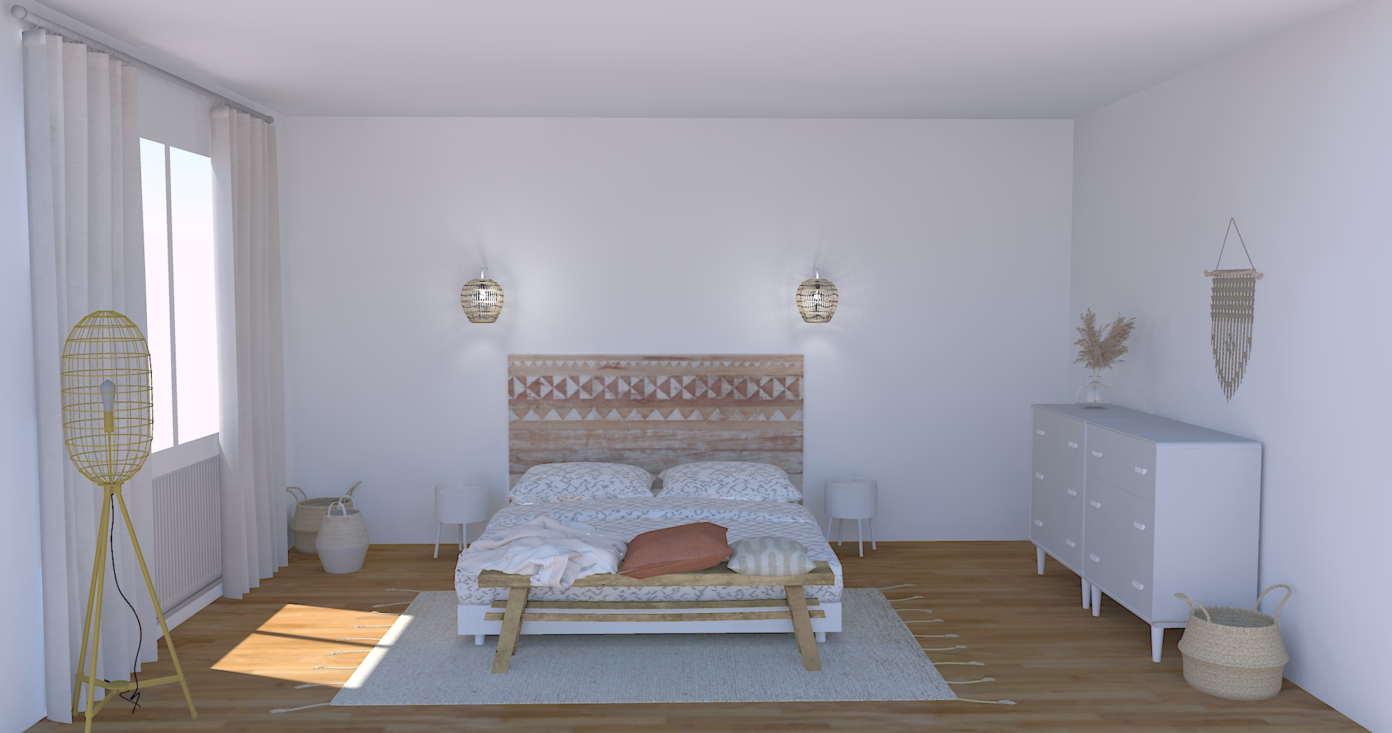 Enfin, j’ajoute des pièces dans un esprit bohème avec des paniers et un macramé en fibre de coco.